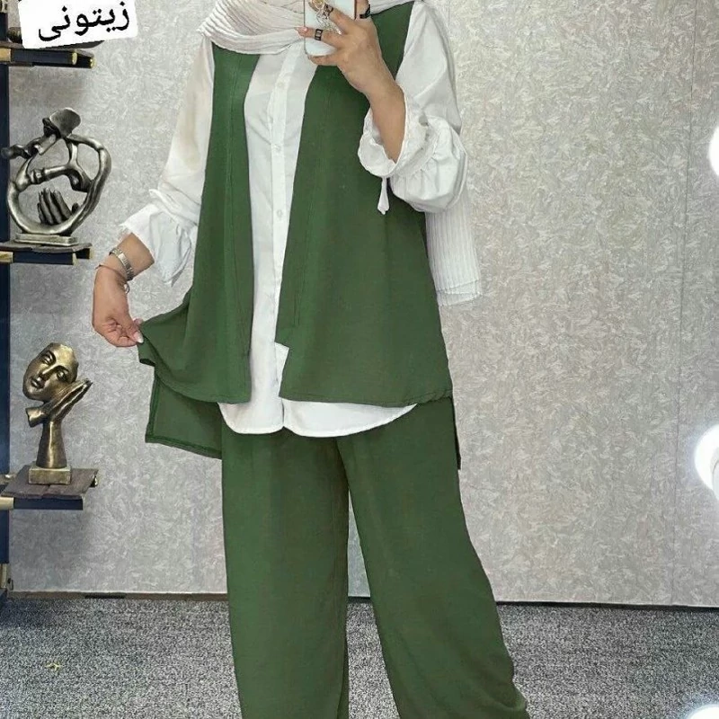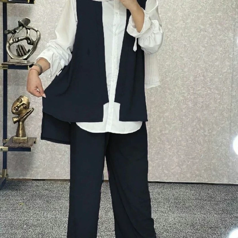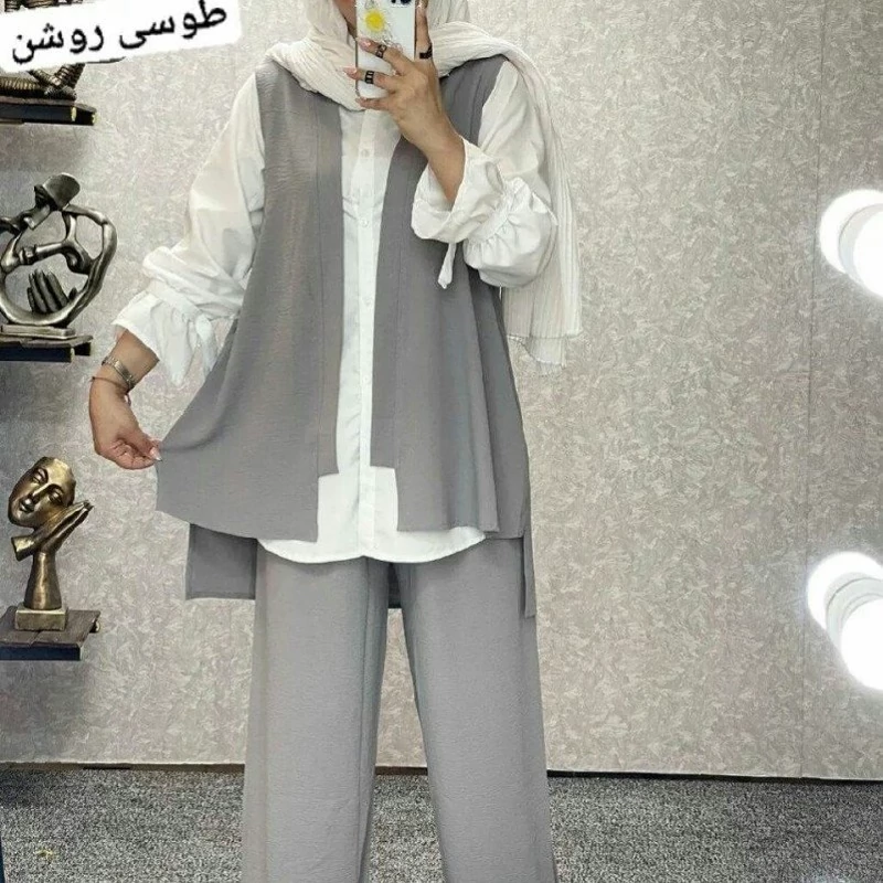 ست سه تیکه ابروبادی قابل استفاده برای سه فصل سال کاری زیبا وجدید وست .شومیز.شلوار جنس ابروبادی. قد شومیز80 قد استین56 قد وست جلو72 پشت82 قدشلوار95